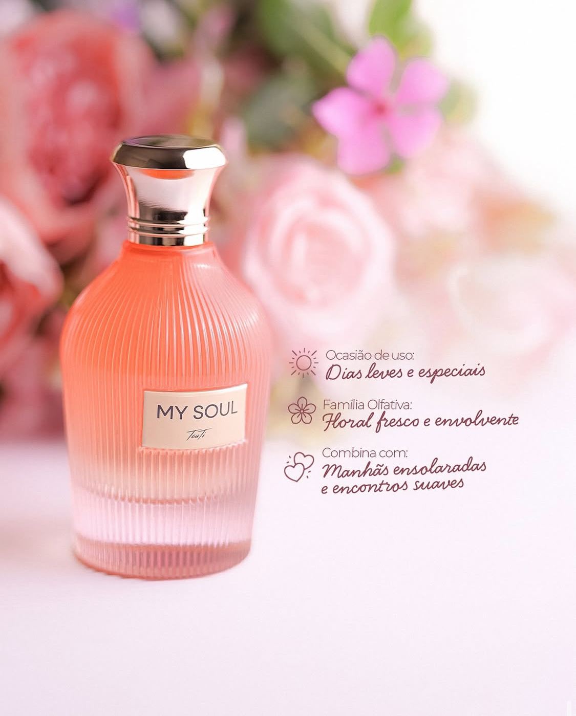 Criado para mulheres que buscam frescor, elegância e autenticidade, o My Soul traduz delicadeza e sofisticação em cada borrifada.